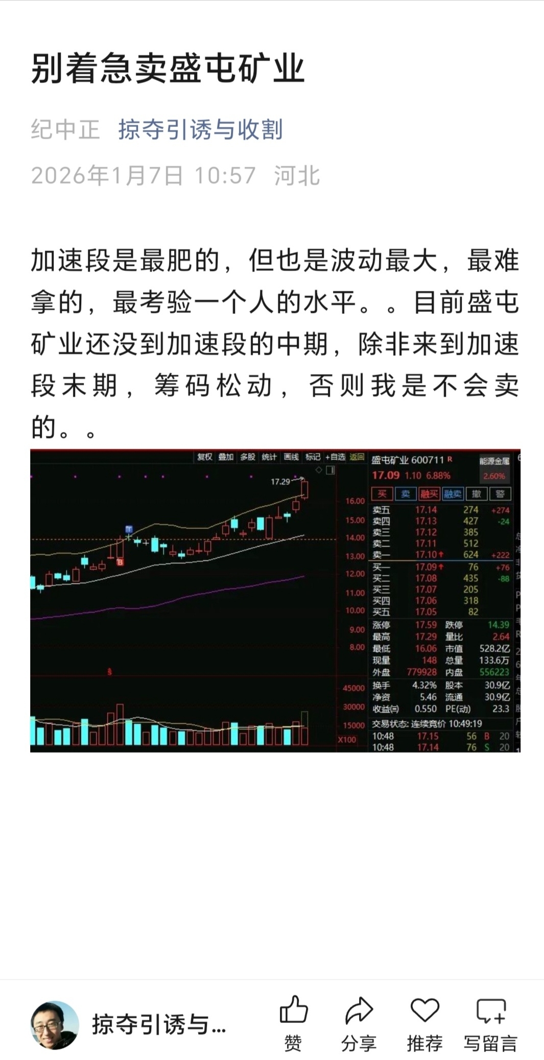 $紫金矿业(SH601899)$ $洛阳钼业(SH603993)$ $北方铜业(SZ000737)$ 加速段是最肥的,但也是波动最大,最难拿的,最考验一个人的水平。。目前盛屯矿业还没到加速段的中期,除非来到加速段末期,筹码松动,否则我是不会卖的。。。