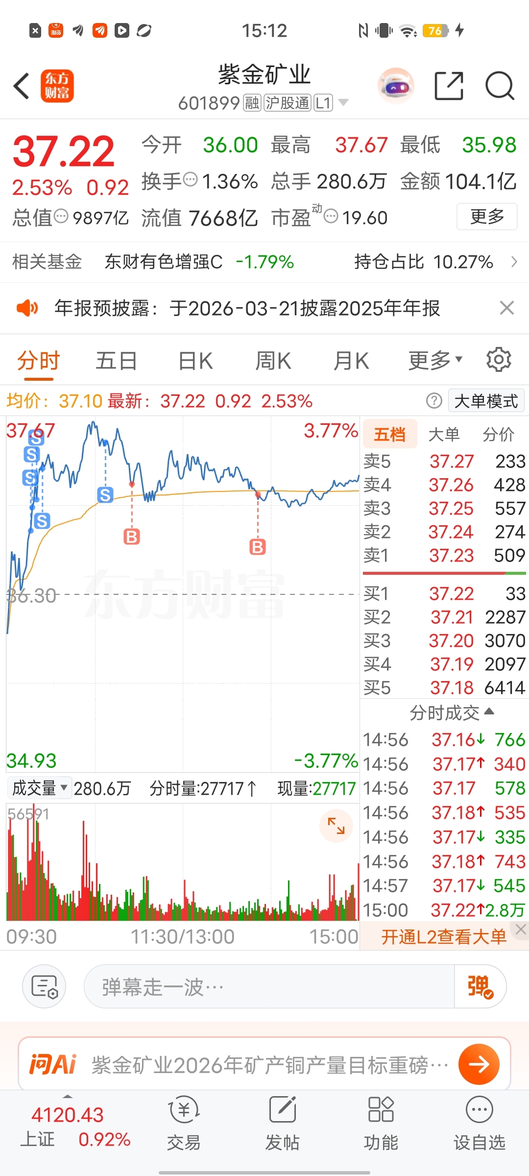 $紫金矿业(SH601899)$ 今天的操作太差了,哎交学费。卖的太早了,利润都没跑起来就被我截断。下次再好好表现,交学费就交学费,反正这个股长期都是上涨的