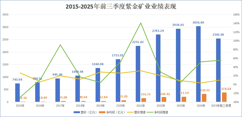 紫金矿业自主勘探与投资并购双轮驱动,持续高成长。从2019年的净利润42.84亿元算起,到2024年的320.5亿元,近6年复合增长率49.5%!2025年三季报,归母净利润378.6亿元,同比增长55.45%,经营净现金流521亿元,增长44.3%,远高于净利润。并预告2025年归母净利润约510亿-520亿元,同比增长59%-62%。当前不足20倍市盈率,严重低估。凭借紫金矿业持续性的50%左右的净利润复合增长率,再加上龙头企业溢价,应该享有40-50倍市盈率估值才合理,股价至少应该翻倍。