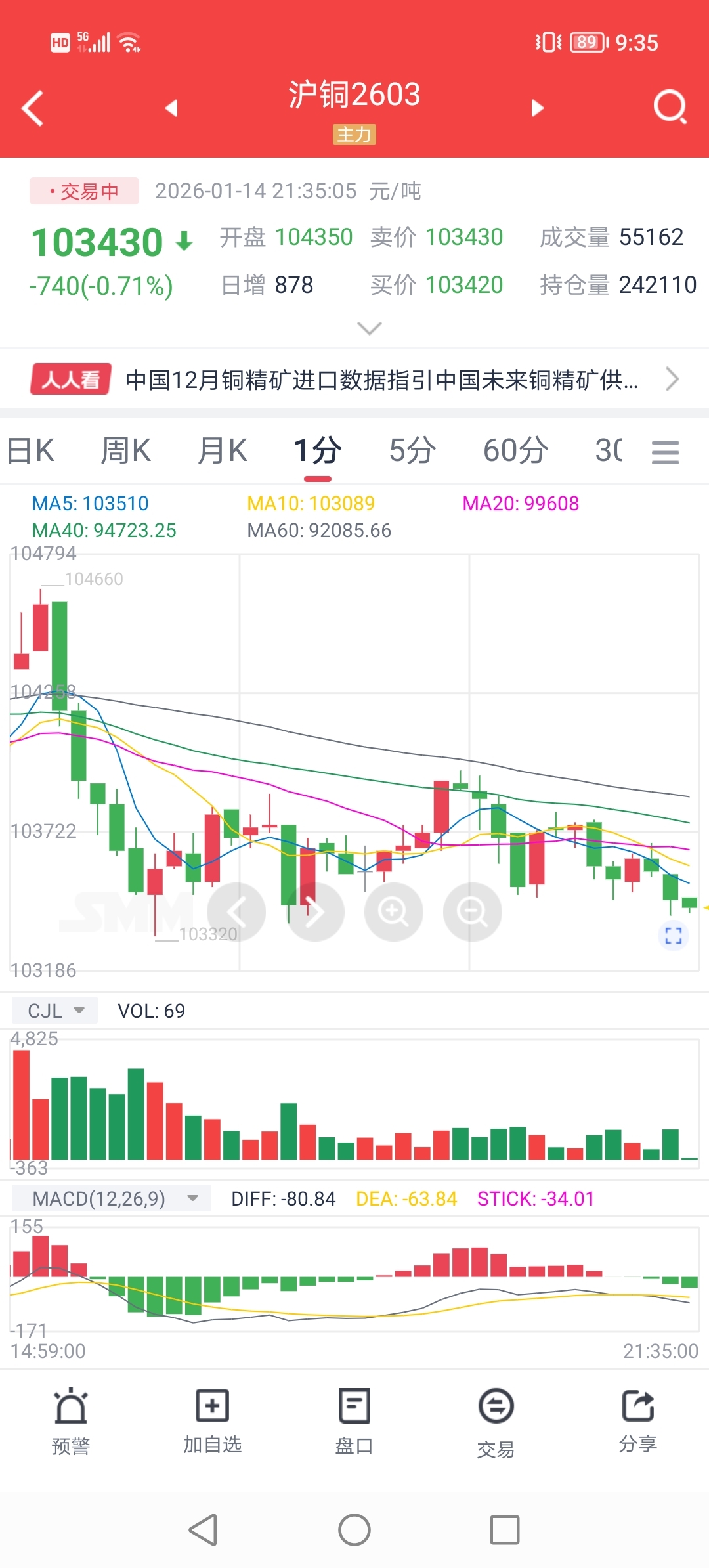 $紫金矿业(SH601899)$ 元月14日夜盘,截止目前沪金小跌3元每克,沪铜已大跌700元