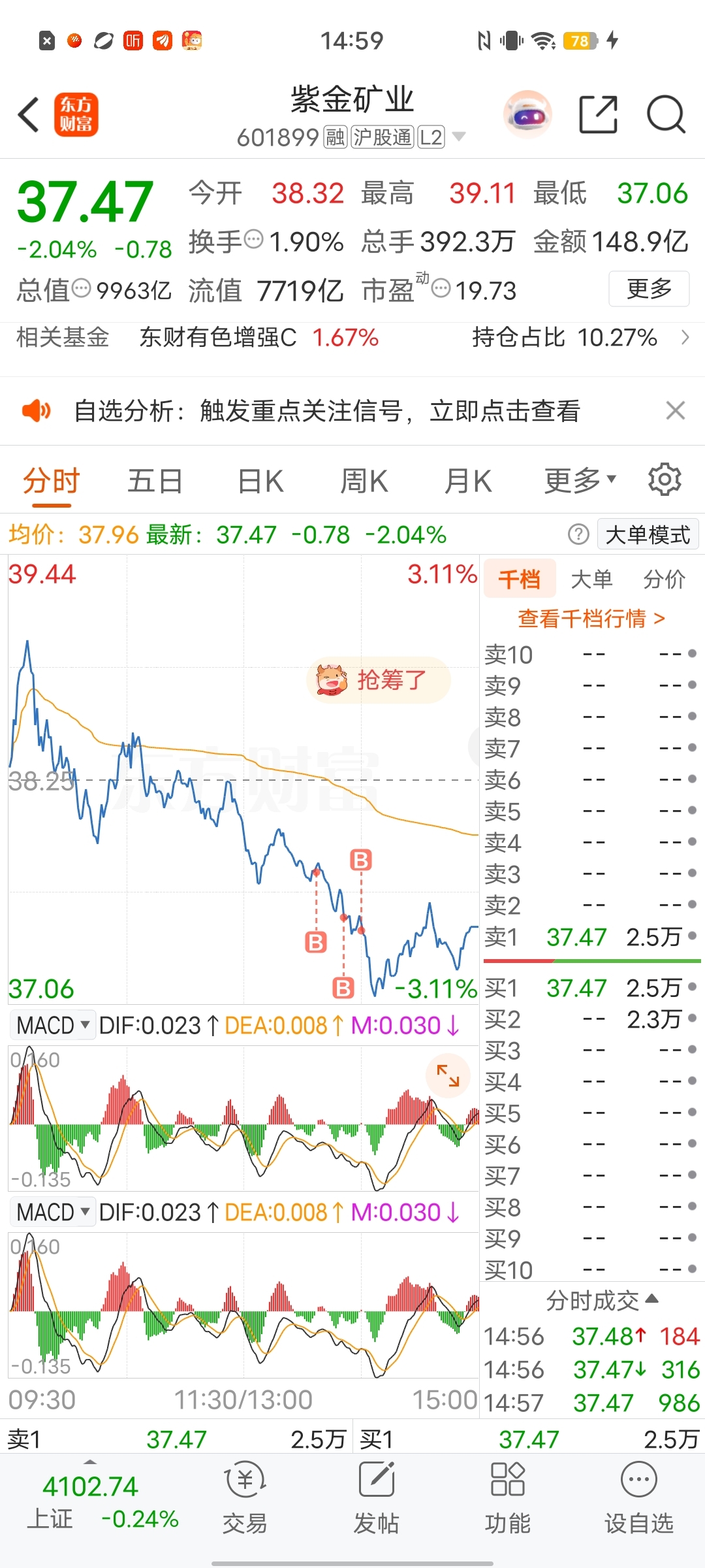 $紫金矿业(SH601899)$ 节奏变了,上涨趋势设置的4个点做T失效,下周借下跌趋势找机会把成本降下来。完全不怕,顺势而为降成本才是我的选择。