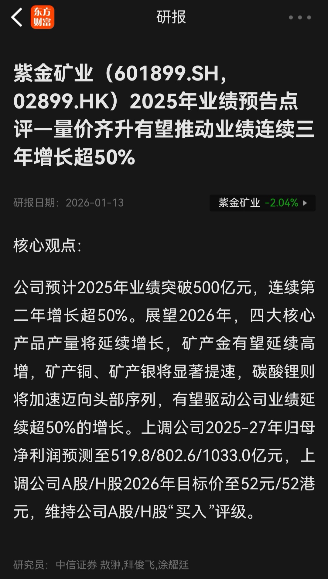 1月13日中信证券的研报2026年归属净利润802.6亿,目标价52元。中信证券