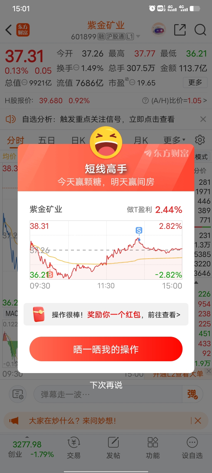 $紫金矿业(SH601899)$ 进来蹲好几天了,每天跌的我烟水钱都没了,明天能起稳吗?#复盘记录#