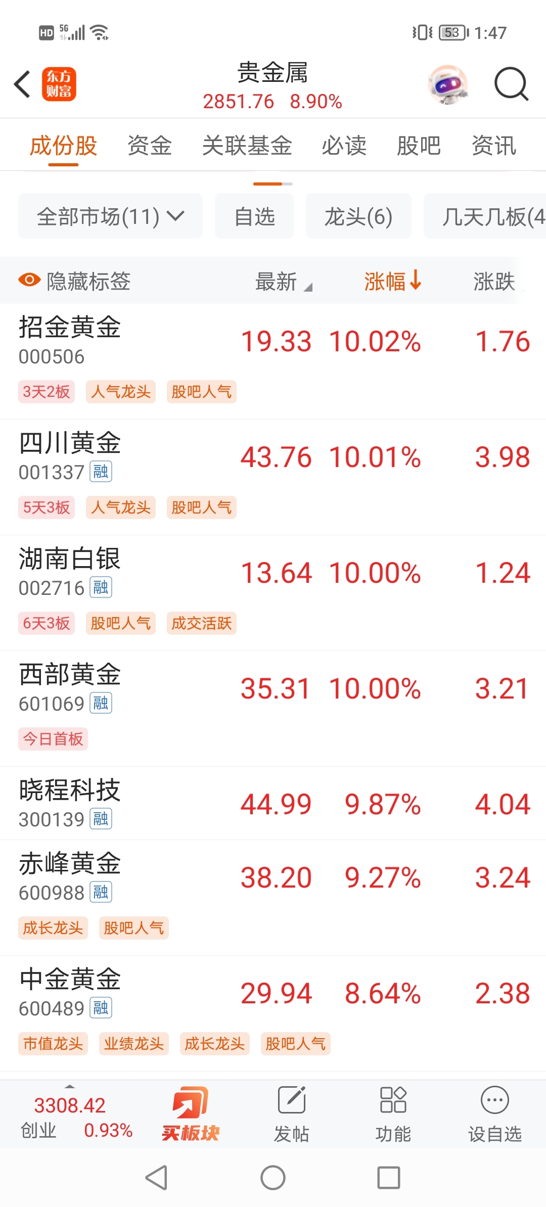 不看不知道,一看吓一大跳!!!贵金属整个板块都接近涨停了呀?你们还是要继续坚持躲