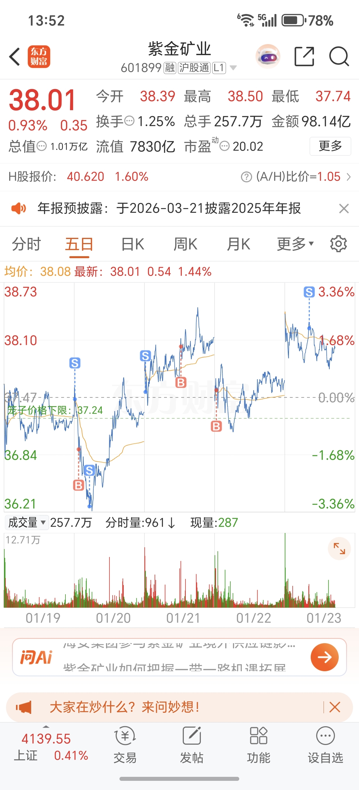 $紫金矿业(SH601899)$ 太折磨我了,39入的场每天t的我前天都t变形了,今天直接走了去黄金etf了,36在接回来,希望各位兄弟发财