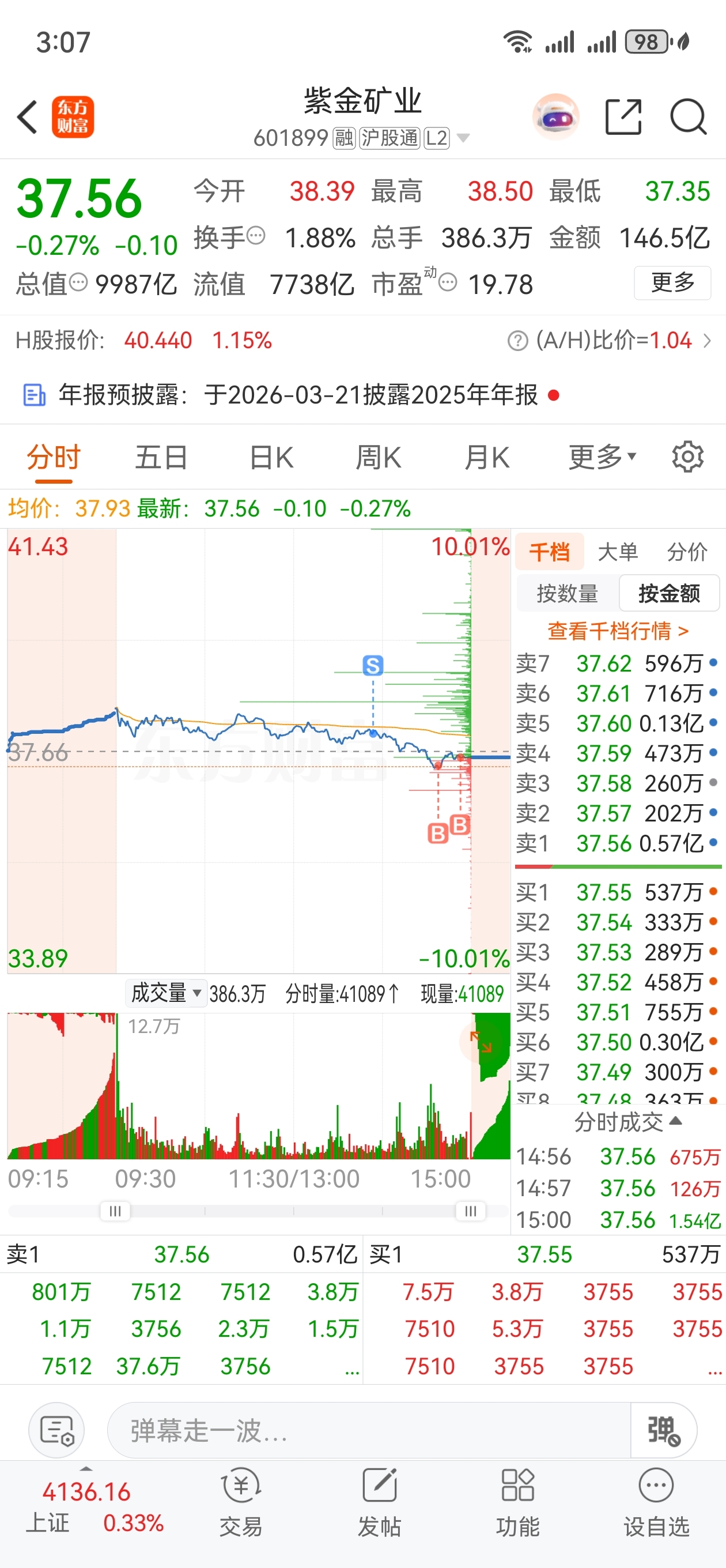 $紫金矿业(SH601899)$ 又做了个T,降低持仓成本,起码保证了今天不亏钱,紫金今天走势太失望了跟山东黄金一个熊样,看看人家四川黄金