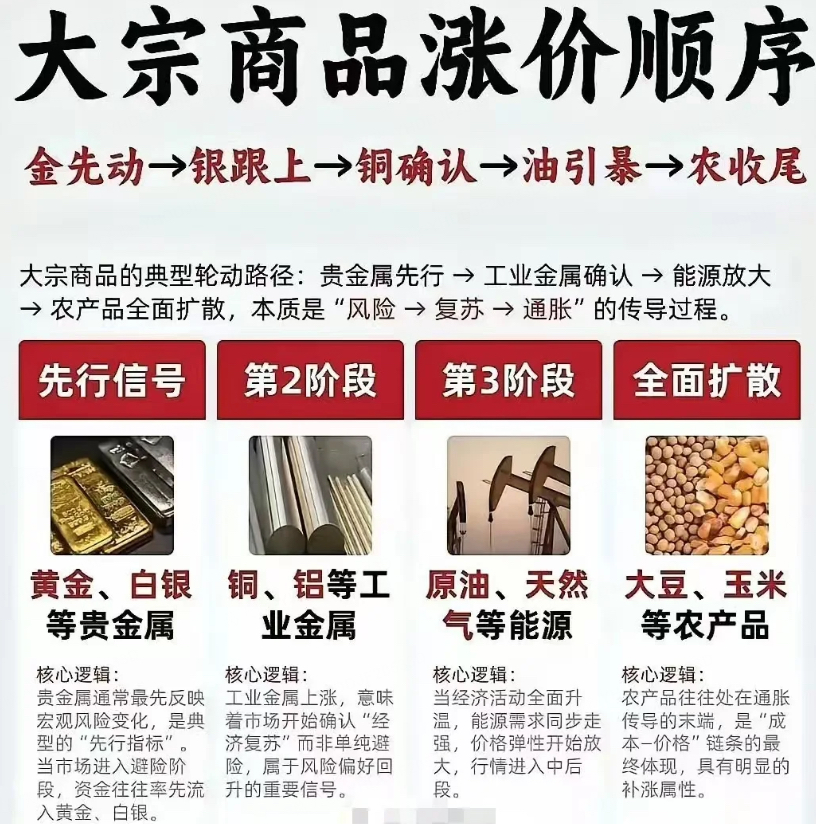 2026年正站在第五轮康波萧条尾端、第六轮康波回升的前夜,这个特殊的时间窗口,让大宗商品的经典轮动逻辑有了更强劲的上涨支撑,贵金属的先行涨势已明,接下来就是工业金属的主场,石油能源的补涨也已箭在弦上,一轮由康波复苏驱动的大宗牛市,正顺着贵金属→工业金属→能源→农产品粮食的脉络,层层展开。