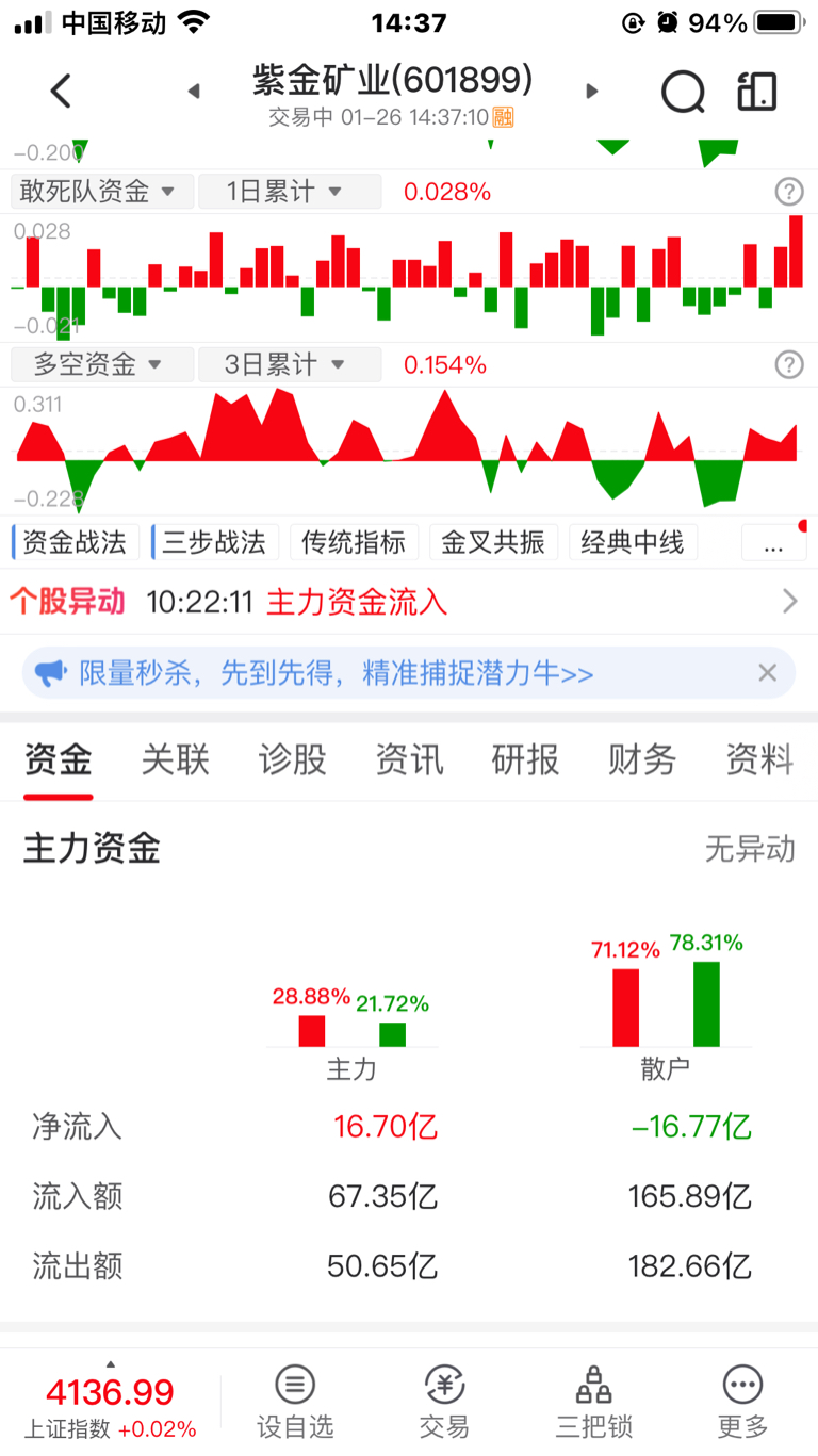 $紫金矿业(SH601899)$ 今天散户出货16个亿,终于齐心合力把主力套在了山顶上。