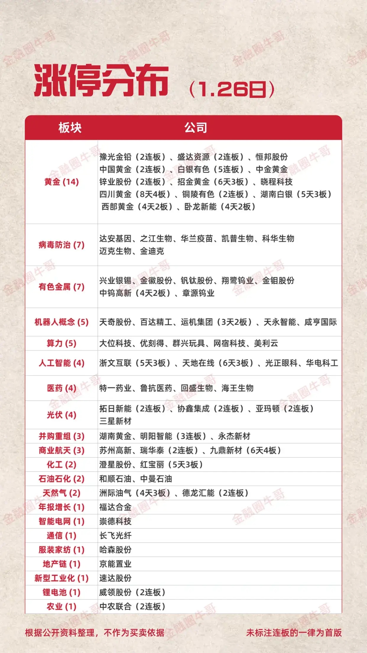 1月26号,涨停分布,看热点,黄金,贵金属,医药,机器人,算力,光伏潜力股推荐中
