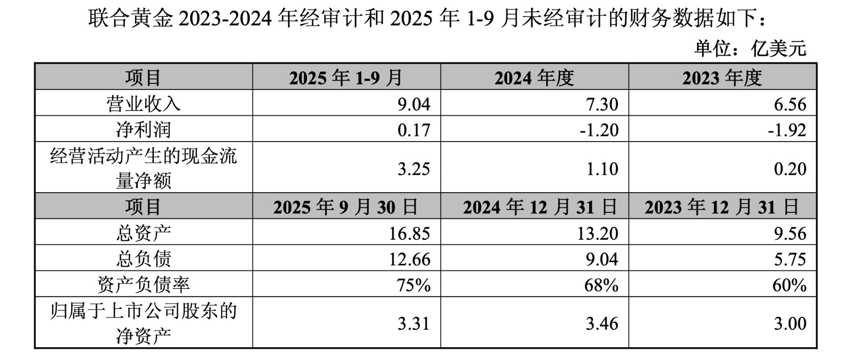 从公司盈利情况看,联合黄金存在连亏两年的情况。2023年,联合黄金净亏损1.92亿美元;2024年,亏损额收窄,但仍高达1.20亿美元。2025年前三季度,联合黄金净利润实现转正,为0.17亿美元,但同期资产负债率高达75%。