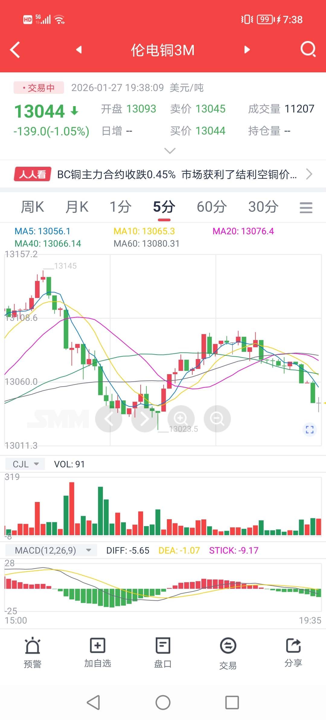27日盘后,目前黄金持平,伦铜大跌超100美元