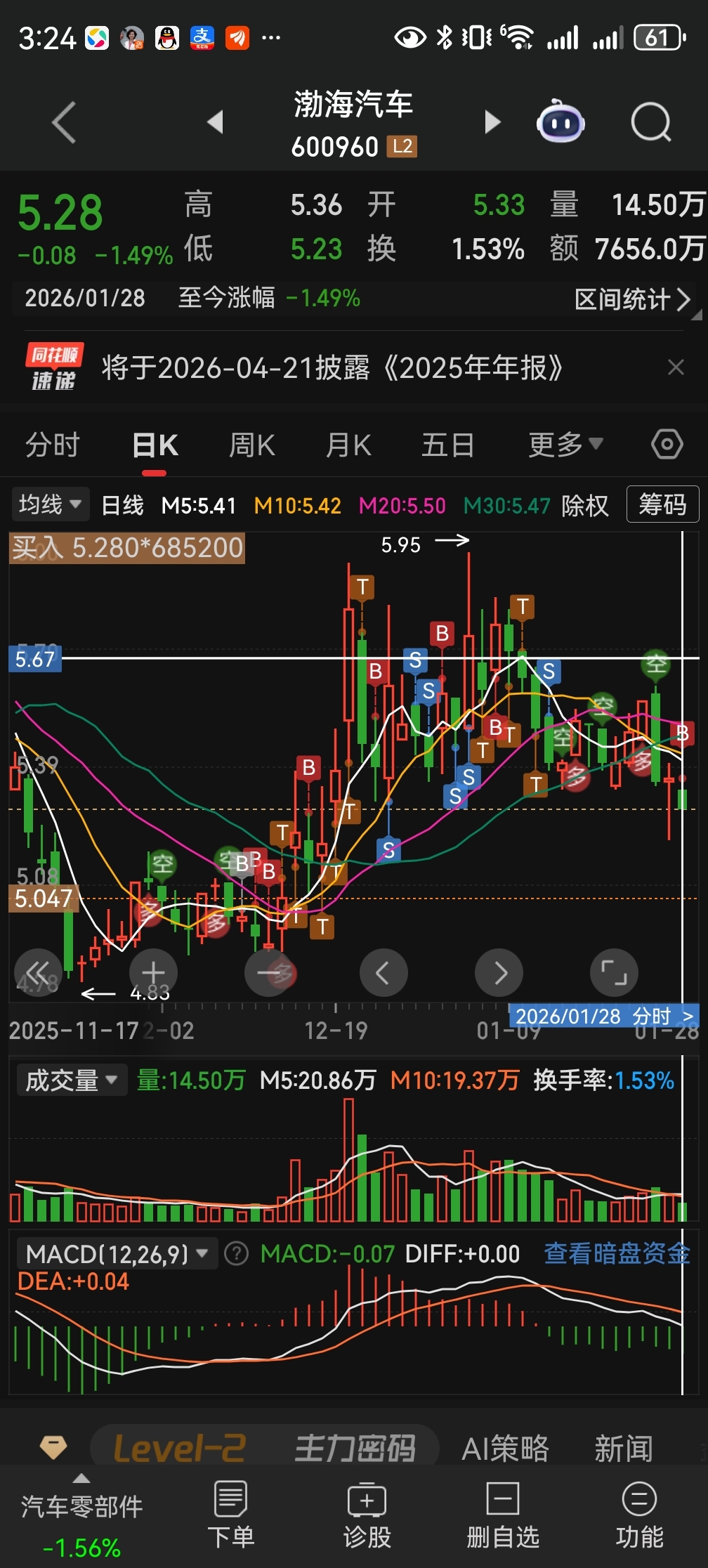 渤海汽车年报预告马上出,扭亏为盈2.7亿今天加仓目标十五