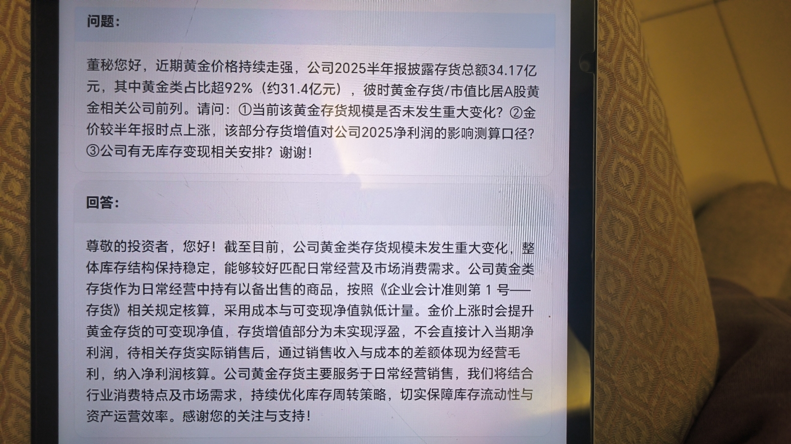 - 截至2025年9月30日,公司存货34.52亿元,与半年报相比变动不大,黄金库存重量推测基本维持在6.3吨左右。