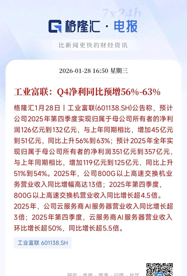 工业富联今天公布了四季度业绩,净利润预增56%-63%。超出了机构的预期,四季度更是环比加速增长。
