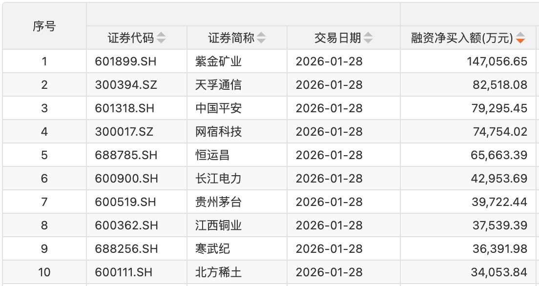 个股方面,64只股获融资净买入额超1亿元。紫金矿业获融资净买入额居首,净买入14.71亿元;融资净买入金额居前的还有天孚通信、中国平安、网宿科技、恒运昌、长江电力、贵州茅台、江西铜业、寒武纪、北方稀土等。