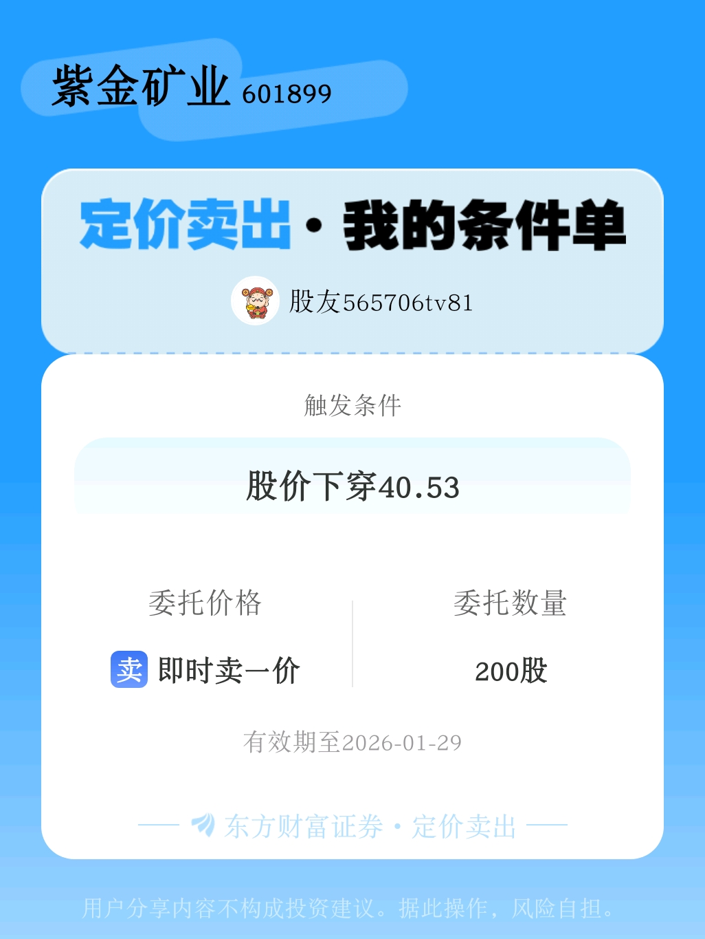 #条件单交流# #定价卖出晒单# 一位股神设置了一个定价卖出条件单,接下来就是见证奇迹的时刻~$紫金矿业(SH601899)$