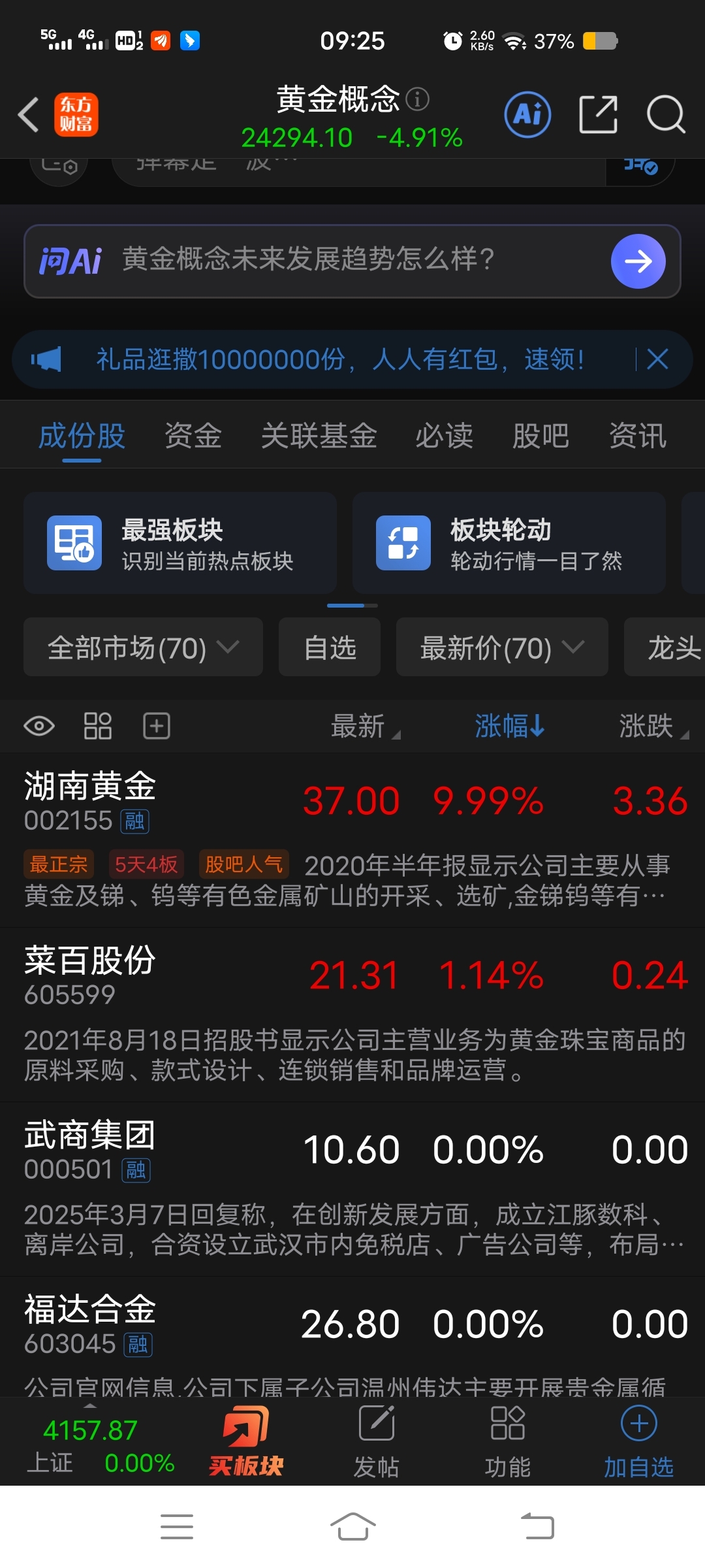 。为什么湖南黄金涨停?紫金矿业却快要跌停了。