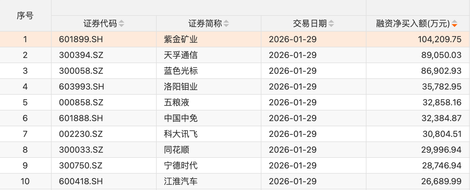 个股方面,52只个股获融资净买入额超1亿元。紫金矿业获融资净买入额居首,净买入10.42亿元;融资净买入额居前的还有天孚通信、蓝色光标、洛阳钼业、五粮液、中国中免、科大讯飞、同花顺、宁德时代、江淮汽车。
