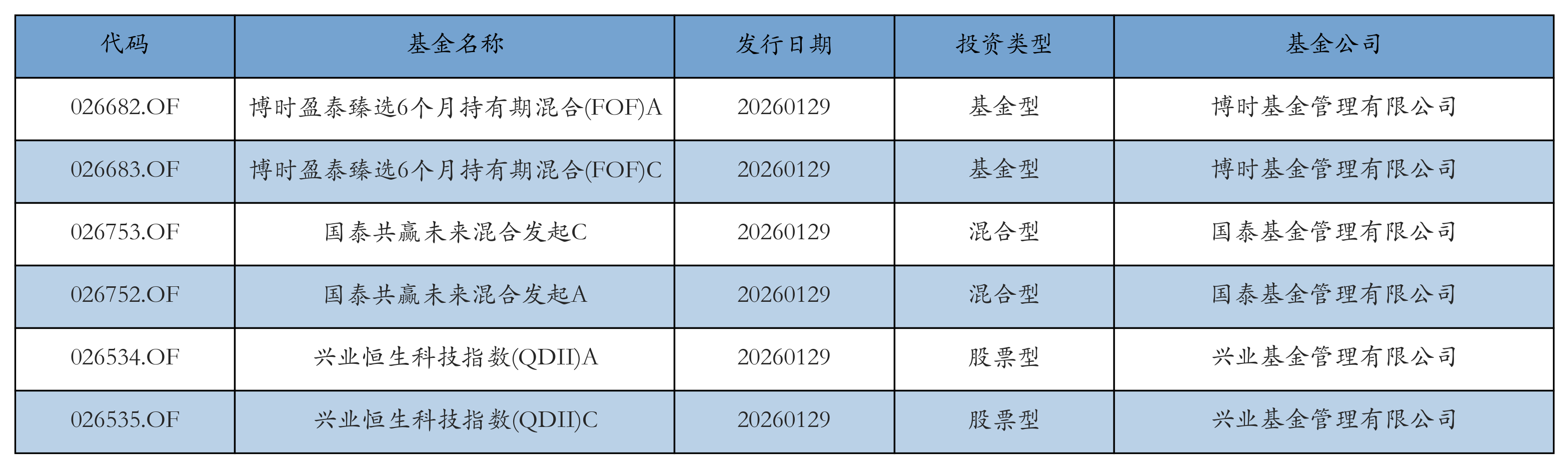 昨日有6只新基金发行,分别为:博时盈泰臻选6个月持有期混合(FOF)A、博时盈泰臻选6个月持有期混合(FOF)C、国泰共赢未来混合发起C、国泰共赢未来混合发起A、兴业恒生科技指数(QDII)A、兴业恒生科技指数(QDII)C,详情见下表: