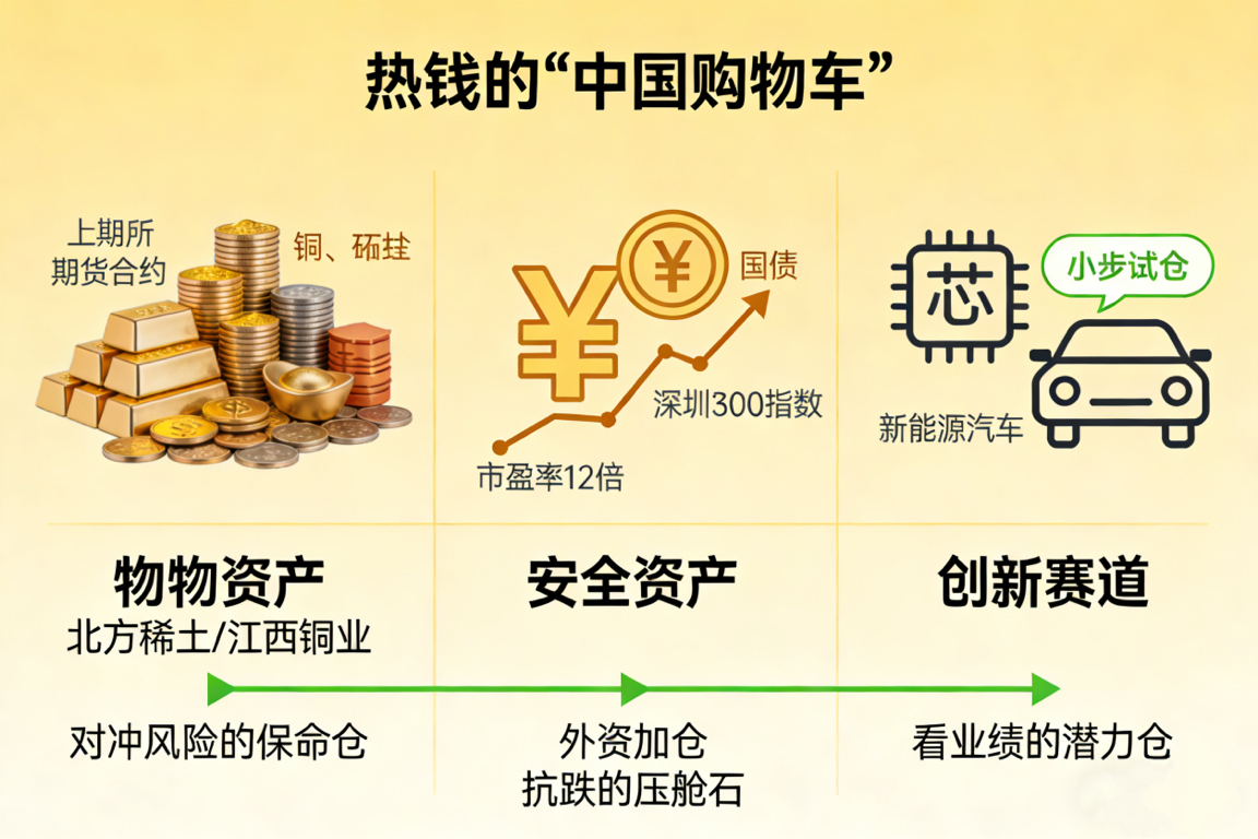 港股科技股、A股新能源、高端制造,最近也有资金进场,但动作克制。这些领域要看政策和业绩,不如实物资产确定。