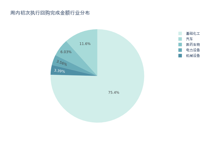 按照初次执行金额所在不同行业分布,金额最高的3个行业分别为:基础化工、汽车、医药生物,详情见下图: