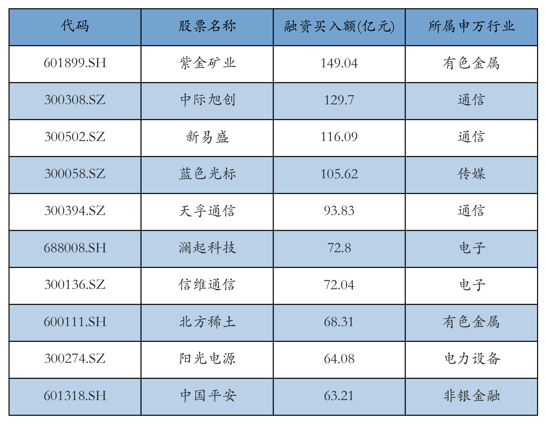 上周两市共有3483只个股有融资资金买入,共有297只个股买入金额超10亿元,其中紫金矿业、中际旭创、新易盛排名前三,买入金额分别149.04亿元、129.7亿元、116.09亿元。融资买入额前10个股详情见下表: