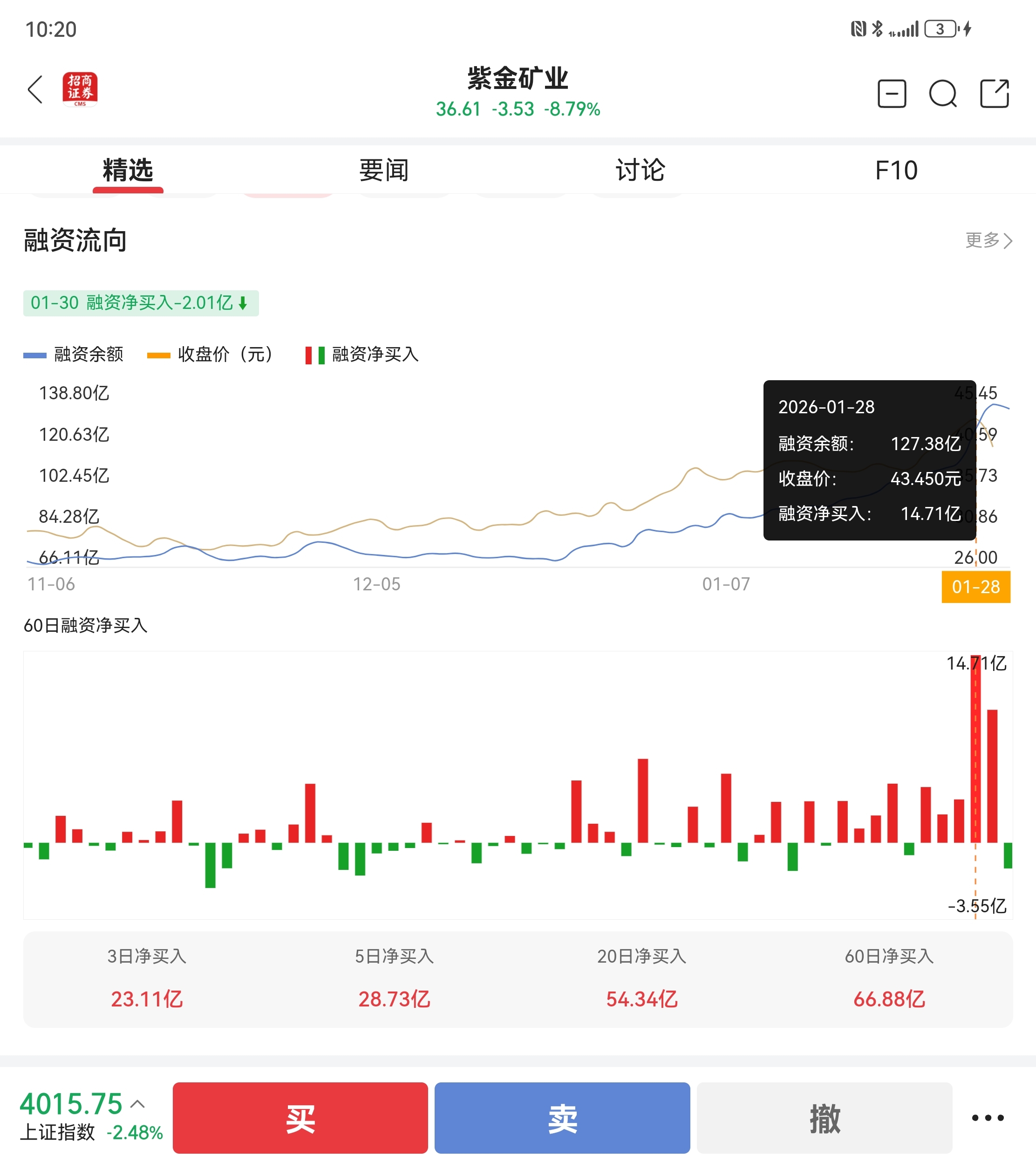 紫金1月28日当天就有14个亿融资盘,过去两周有50亿融资盘筹码在35-44元,