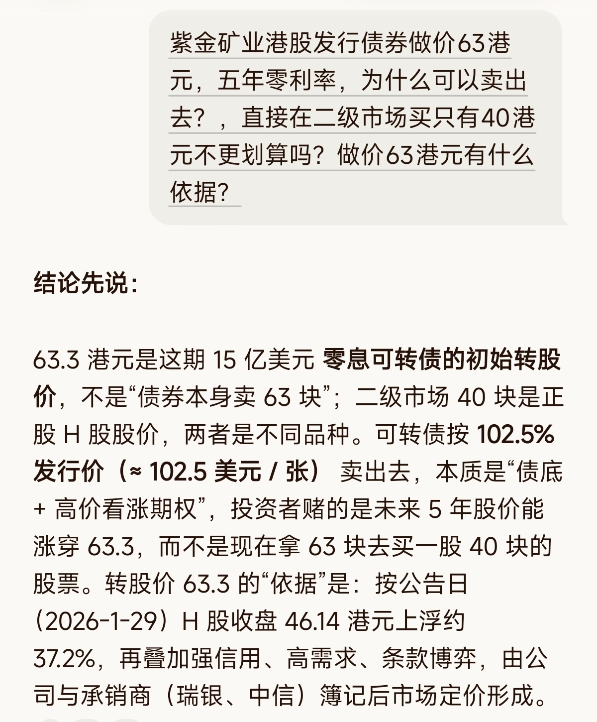 $紫金矿业(SH601899)$ 紫金矿业港股发行债券做价63港元,五年零利率,为什么可以卖出去?,直接在二级市场买只有40港元不更划算吗?做价63港元有什么依据?