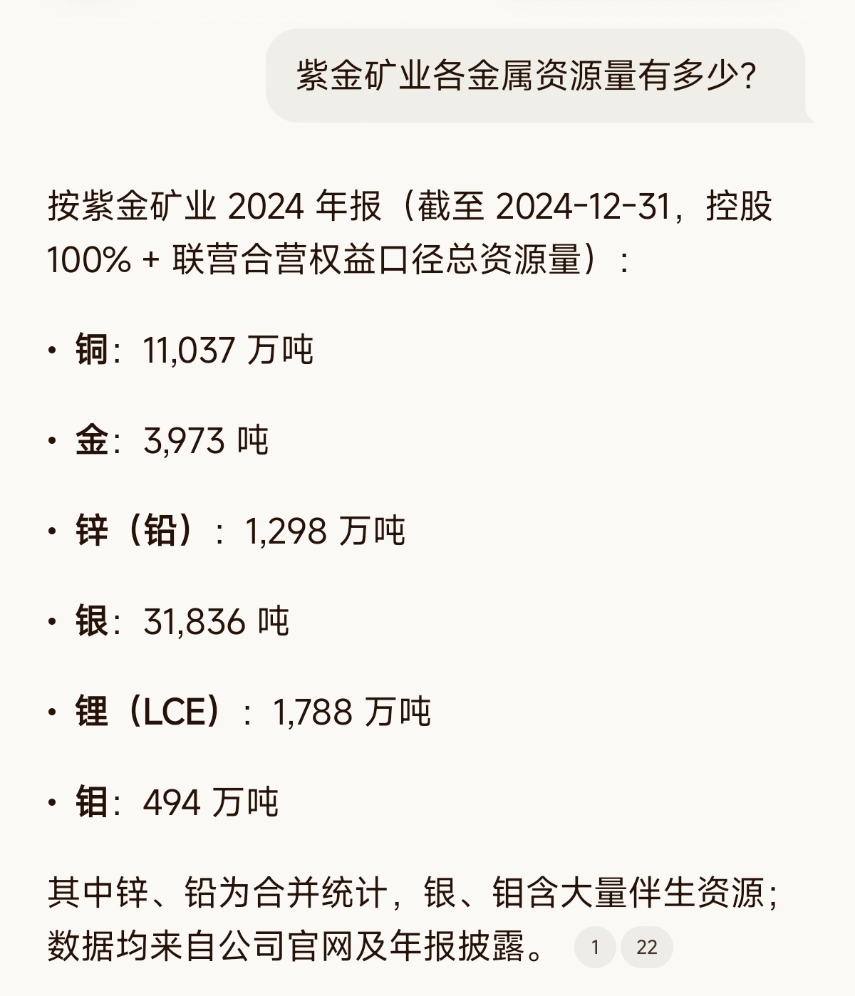 按紫金矿业 2024 年报(截至 2024‑12‑31,控股 100% + 联营合营权益口径总资源量):