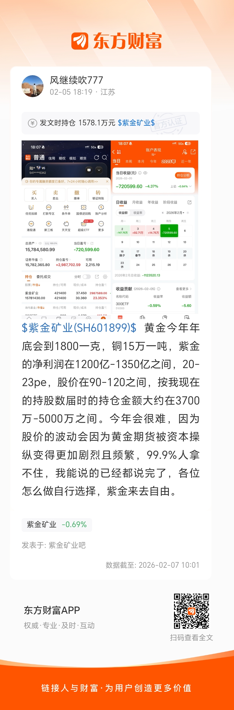 $紫金矿业(SH601899)$ 黄金今年年底会到1800一克,铜15万一吨,紫金的净利润在1200亿-1350亿之间,20-23pe,股价在90-120之间,按我现在的持股数届时的持仓金额大约在3700万-5000万之间。今年会很难,因为股价的波动会因为黄金期货被资本操纵变得更加剧烈且频繁,99.9%人拿不住,我能说的已经都说完了,各位怎么做自行选择,紫金来去自由。