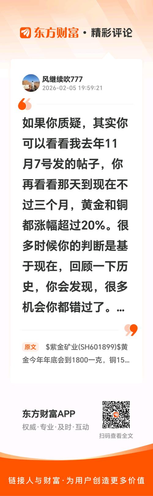 俯视//@风继续吹777 :如果你质疑,其实你可以看看我去年11月7号发的帖子,你再看看那天到现在不过三个月,黄金和铜都涨幅超过20%。很多时候你的判断是基于现在,回顾一下历史,你会发现,很多机会你都错过了。再过半年很多天依然会后悔错过了现在这么便宜的紫金。