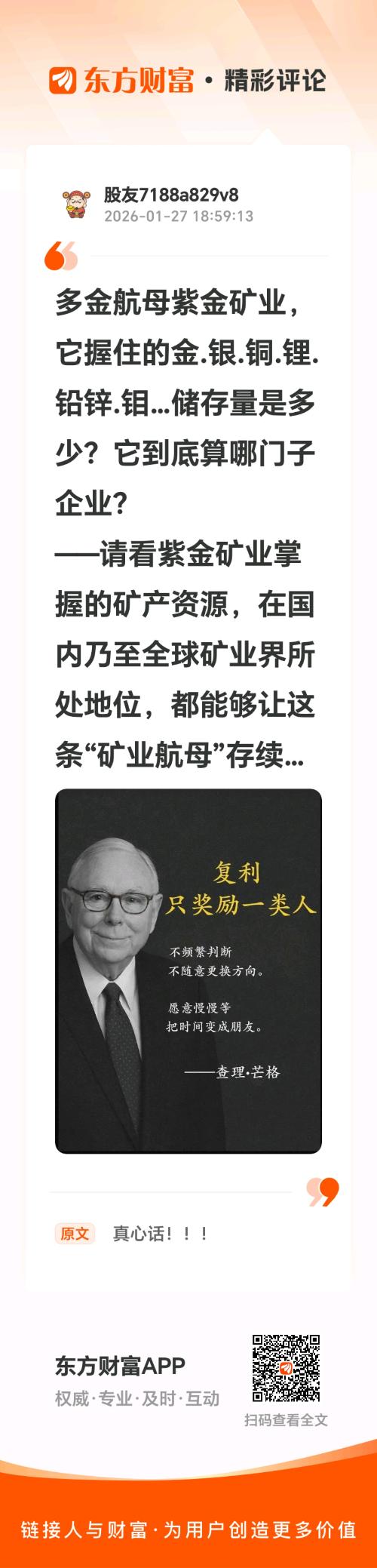 数据说话//@股友7188a829v8 :多金航母紫金矿业,它握住的金.银.铜.锂.铅锌.钼…储存量是多少?它到底算哪门子企业?——请看紫金矿业掌握的矿产资源,在国内乃至全球矿业界所处地位,都能够让这条“矿业航母”存续百年。 但对A股投资者而言: 如果你是赌博之人,最好别碰。 如果你是趋势投资者,今天正是有色金属巨无霸龙头的春天。 如果你是价值投资铁杆,就大可放松心情、握着它的股权十年二十年,做时间的朋友,它会让你慢富,直至传承子孙。阿里Al千问是这么分析紫金矿业基本面的。民间有人说它的金银铜锂四大资源储量,就是A股里同类所有上市公司储备量总和甚至更多?它的几个世界级矿源,紫金矿业百年也开采不完…。它的单一铜资源储量就相当于中国全部铜资源矿的1.2倍(国内己勘探铜总储量8500万吨),而紫金矿业一家就握着全球含国内铜资源1.1亿吨!仅在国内控股的第一大矿源西藏巨龙铜资源就高达2580万吨,紫金矿业不仅是A股的“资源之王”,更是世界级位居前三位的矿业巨头。除了铜,其它如金,银,锂,铅锌,钼…,在A股同行业的能与之比肩的企业,更是难上加难。它能凭借实力,还手握全球有色金属定价权,是国内唯一能与全球矿业三巨头(必和必拓、力拓、淡水河谷)在铜、金领域能够正面硬刚的企业。Al千问解读如下:紫金矿业确实是全球矿业版图中不可忽视的巨头,被称为“矿业印钞机”。关于你提到的“巨无霸”地位以及民间流传的“储量超过同类总和”的说法,我为你整理了基于最新财报和行业数据的详细分析。——紫金矿业核心资源储量一览表根据最新的数据(截至2025年底/2024年报),紫金矿业掌握的核心资源储量如下:核心矿种 资源量/储量 全球/国内地位铜 1.1亿吨 全球第5,相当于中国总储量的124%(约8800万吨)。黄金 3973吨 全球第6,中国第一。锂 1788万吨 全球第10 (碳酸锂当量)。锌 (铅) 约1300万吨 全球第3。银 约3.2万吨 全球第6。钼 约500万吨 全球第1。…这么多储量和品种,将为紫金矿业打下百年根基,更是为其股东创造无尽的财富。长握紫金矿业,慢富胜过三代!