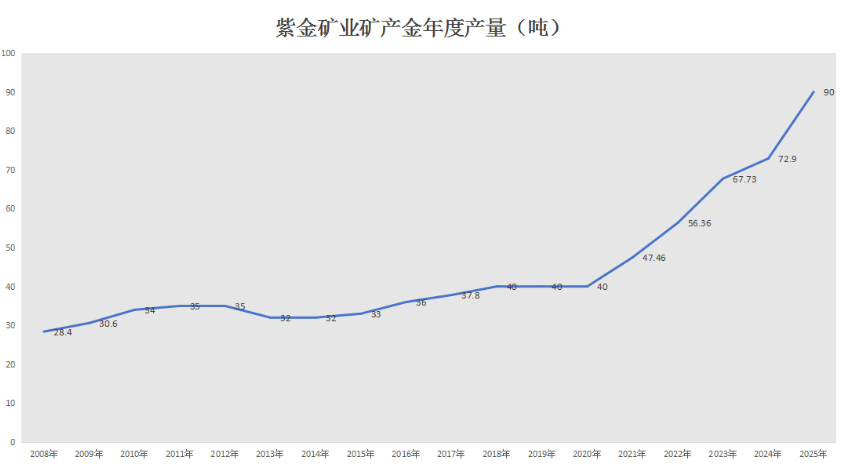 上述背景下,紫金矿业提出了更高的产量目标,而130-140吨的产量规划要求公司未来三年矿产金产量再增40-50吨,较2025年基数增长50%。