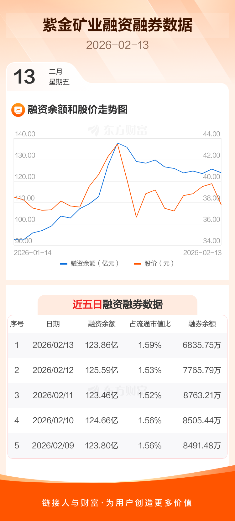 交易所最新数据显示,紫金矿业于2026年2月13日获融资买入13.94亿元,融资偿还15.67亿元,当日融资净偿还1.73亿元。目前,该股融资余额123.86亿,占流通市值比例为1.59%。
