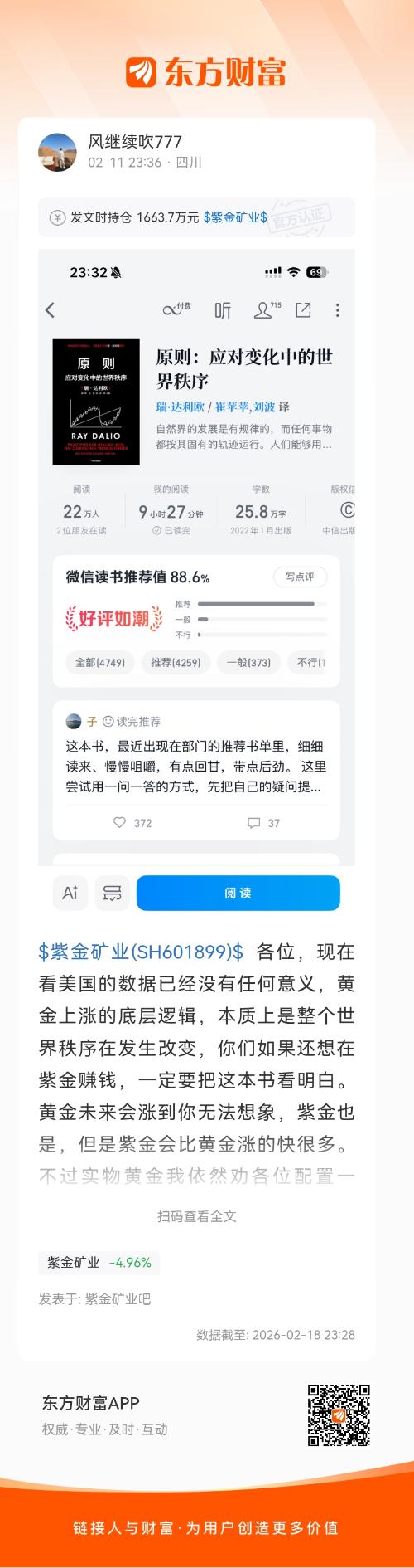 $紫金矿业(SH601899)$ 各位,现在看美国的数据已经没有任何意义,黄金上涨的底层逻辑,本质上是整个世界秩序在发生改变,你们如果还想在紫金赚钱,一定要把这本书看明白。黄金未来会涨到你无法想象,紫金也是,但是紫金会比黄金涨的快很多。不过实物黄金我依然劝各位配置一些,因为很快你就会买不到了。股票赚的依然是传统货币,而实物黄金未来某一天可以置换传统货币以外的东西。