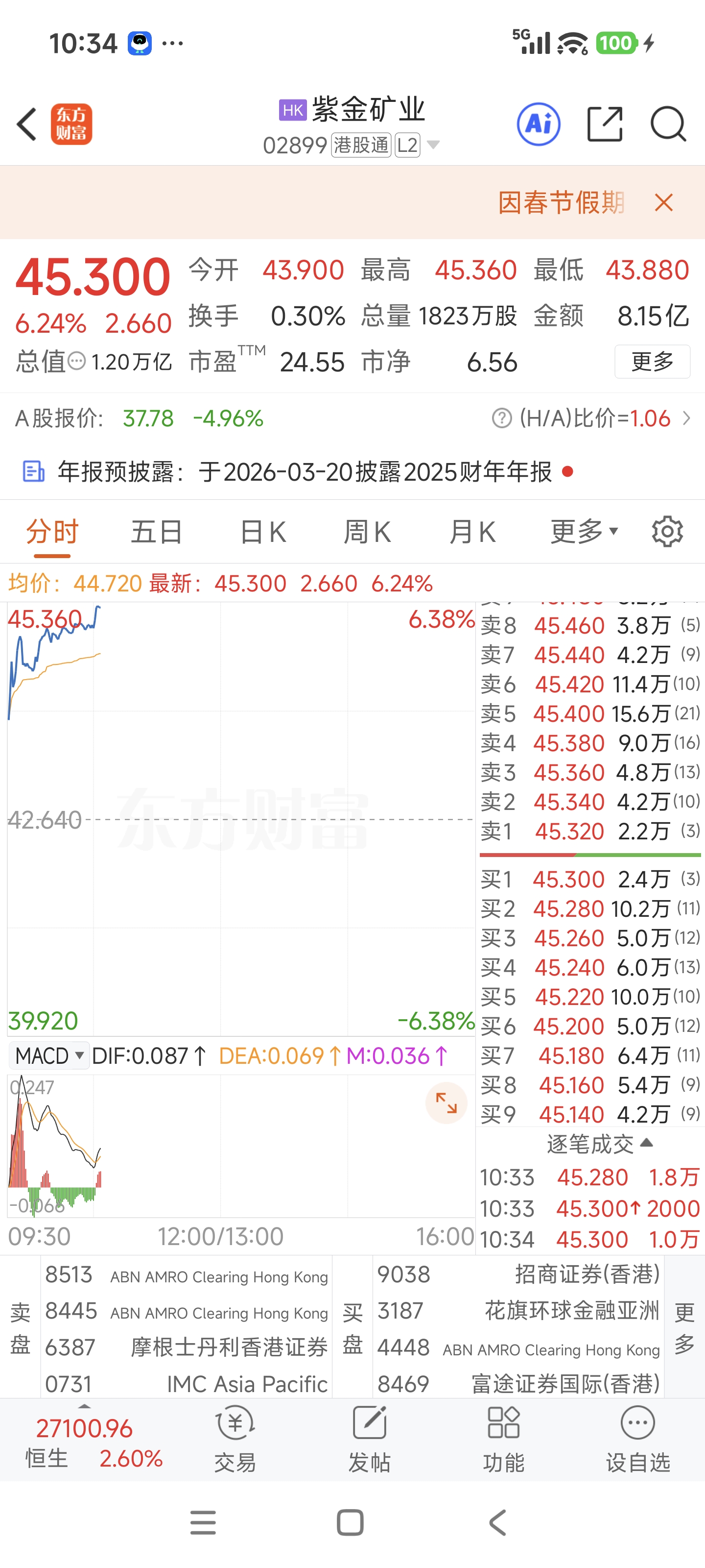 港股紫金开盘暴涨到45.3了,远远超过A股,A股明天开盘理论应涨停!