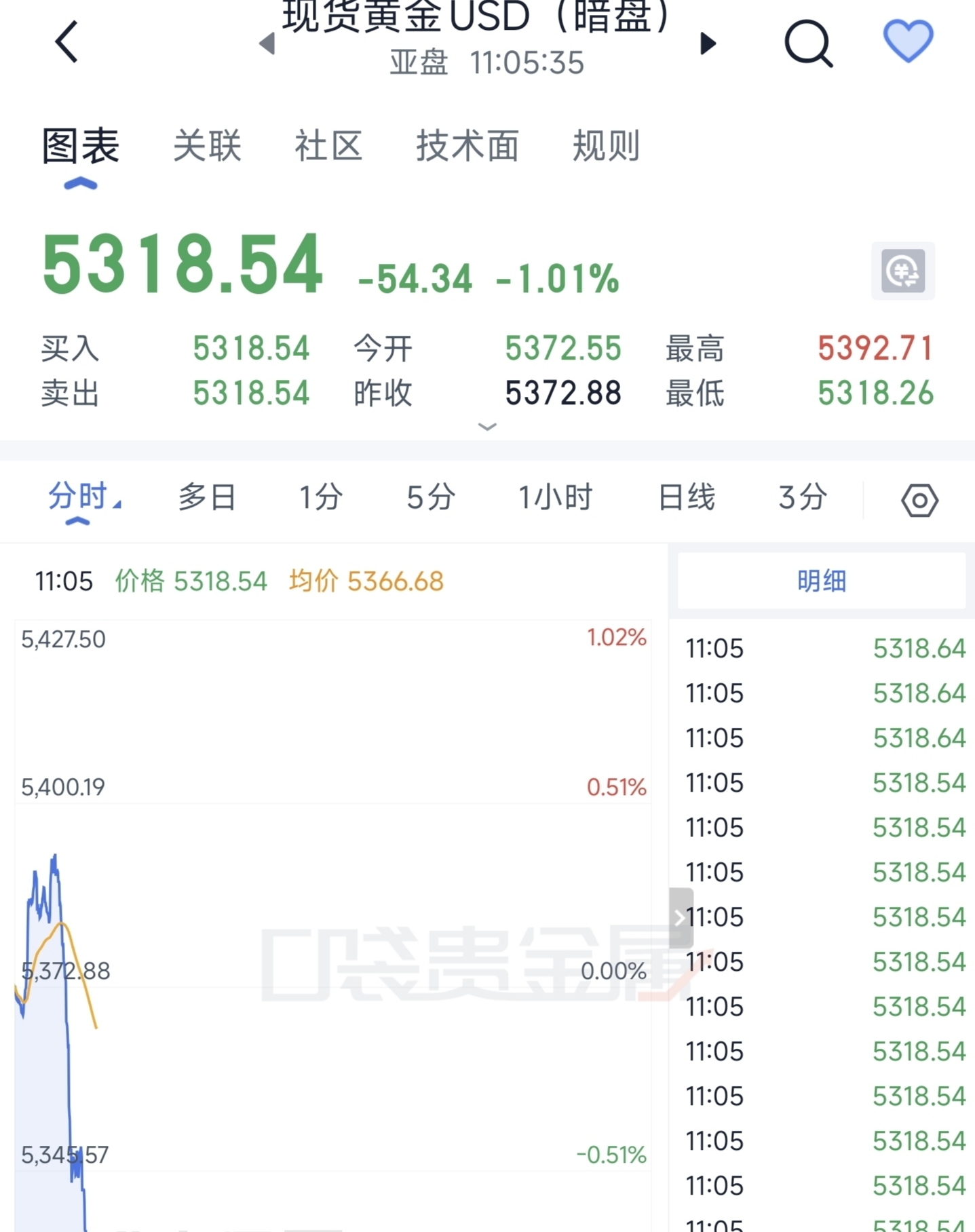 暗盘黄金大暴跌,赶紧挂跌婷吧现在,到时候看运气能不能排出来