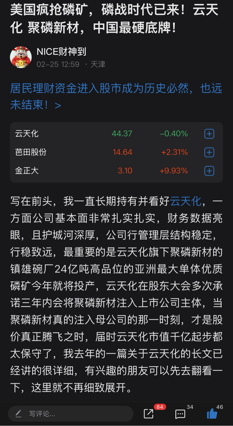 我也在2月22日写下了《美国疯抢磷矿,磷战时代已来!云天化聚磷新材,中国最硬底牌!》长文,果不其然,初八一开盘,云天化,金正大、兴发集团等磷矿股纷纷连板。