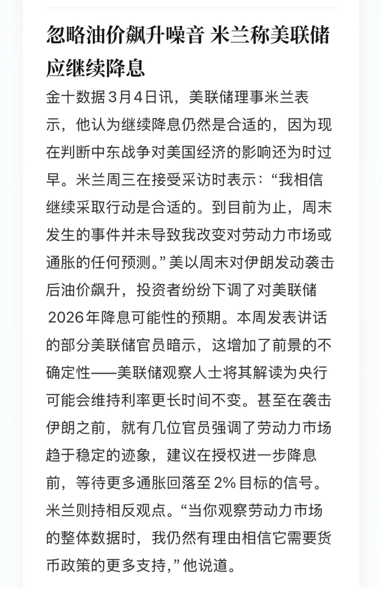 $紫金矿业(SH601899)$ 美联储理事米兰:适宜在3月会议上继续降息;目前未因伊朗冲突爆发而改变前景展望。