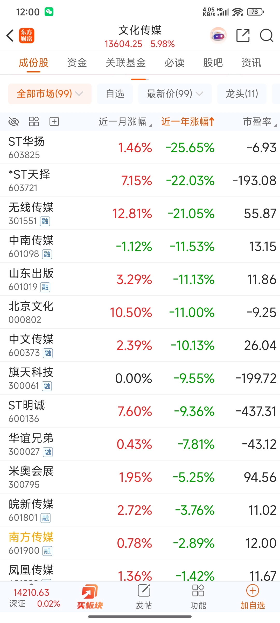 近一年涨幅,99个文化传媒,倒数13。真的是