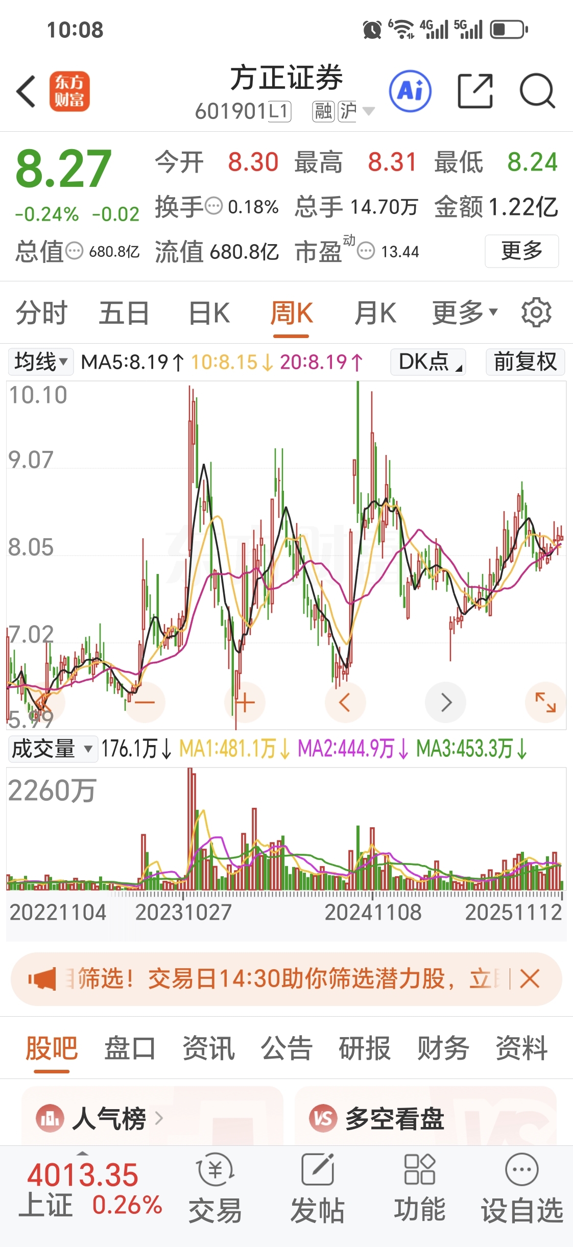 $方正证券(SH601901)$ 从周线图来看,每一次上涨都是要先跌下来再涨上去的,而且只能涨到10块多元。不然上涨没有空间的。