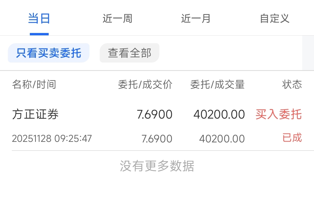 $方正证券(SH601901)$ 方正证券连续调整下来一周,今天买入。