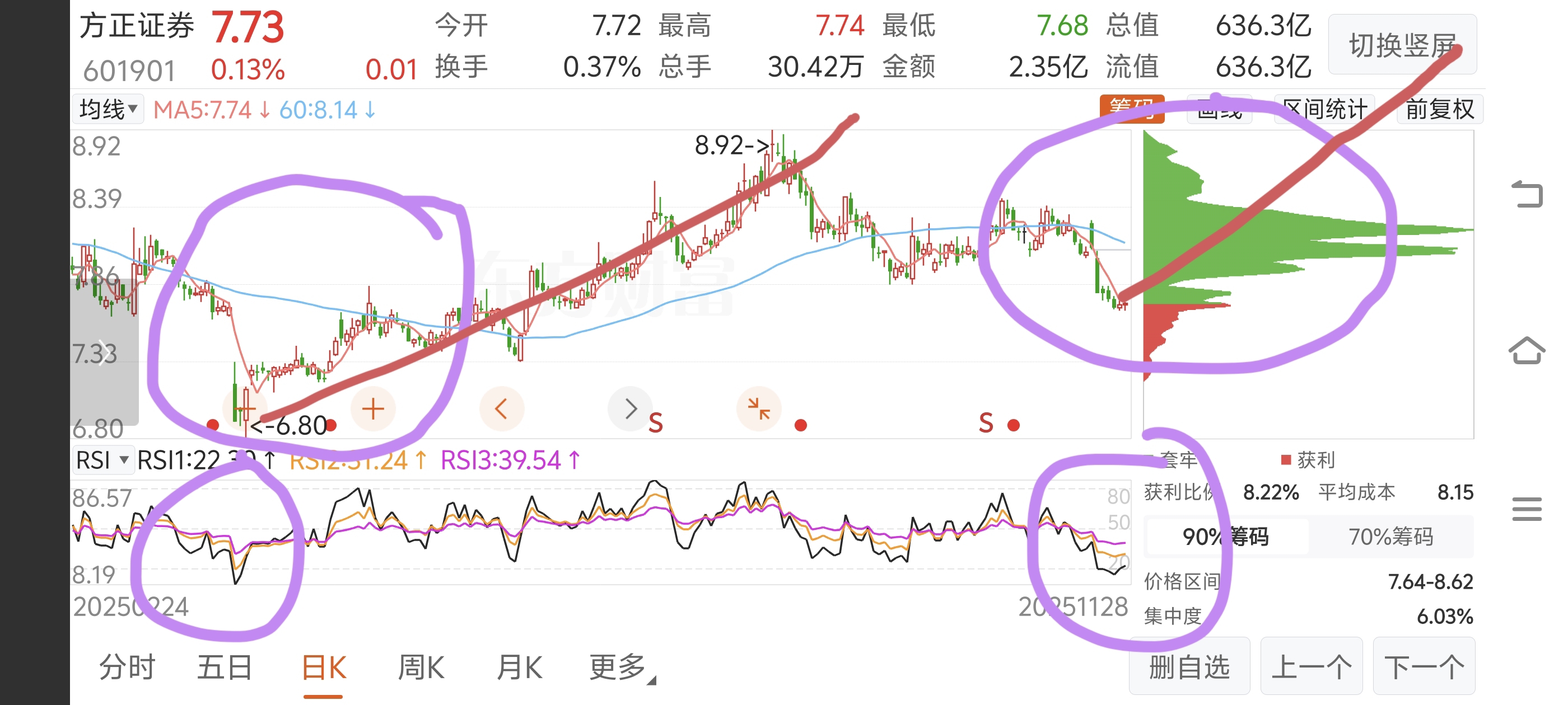 $方正证券(SH601901)$ 上半年跌到6.8涨到8.9这次跌到7.7可以涨到9.8!图形一样,跌出空间跌到位了,RSI绝对超卖后面只会涨