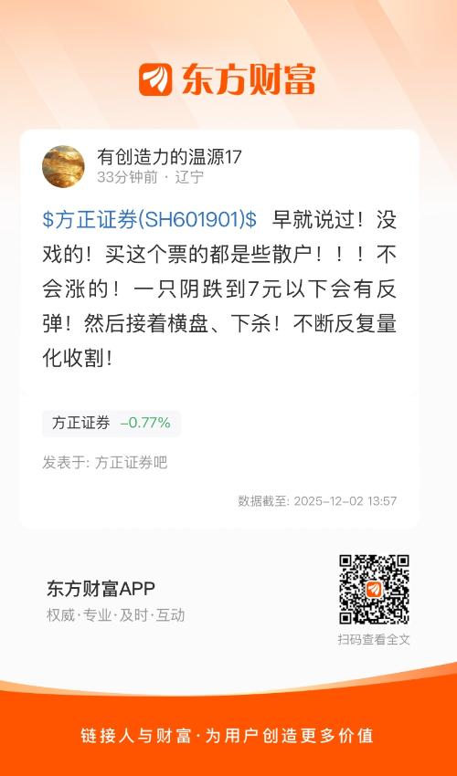 $方正证券(SH601901)$ 早就说过!没戏的!买这个票的都是些散户!!!不会涨的!一只阴跌到7元以下会有反弹!然后接着横盘、下杀!不断反复量化收割!