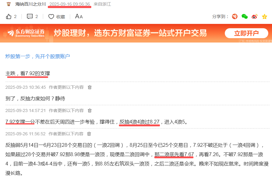 8月27日见顶 7.92看支撑喊反弹 反弹过8.27, 之后看7.67,实际到了7.61 0.6分红 喊3%阳线。