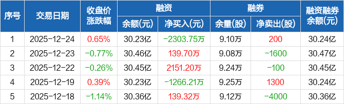 方正证券:融资净偿还2303.75万元,融资余额30.23亿元(12-24)