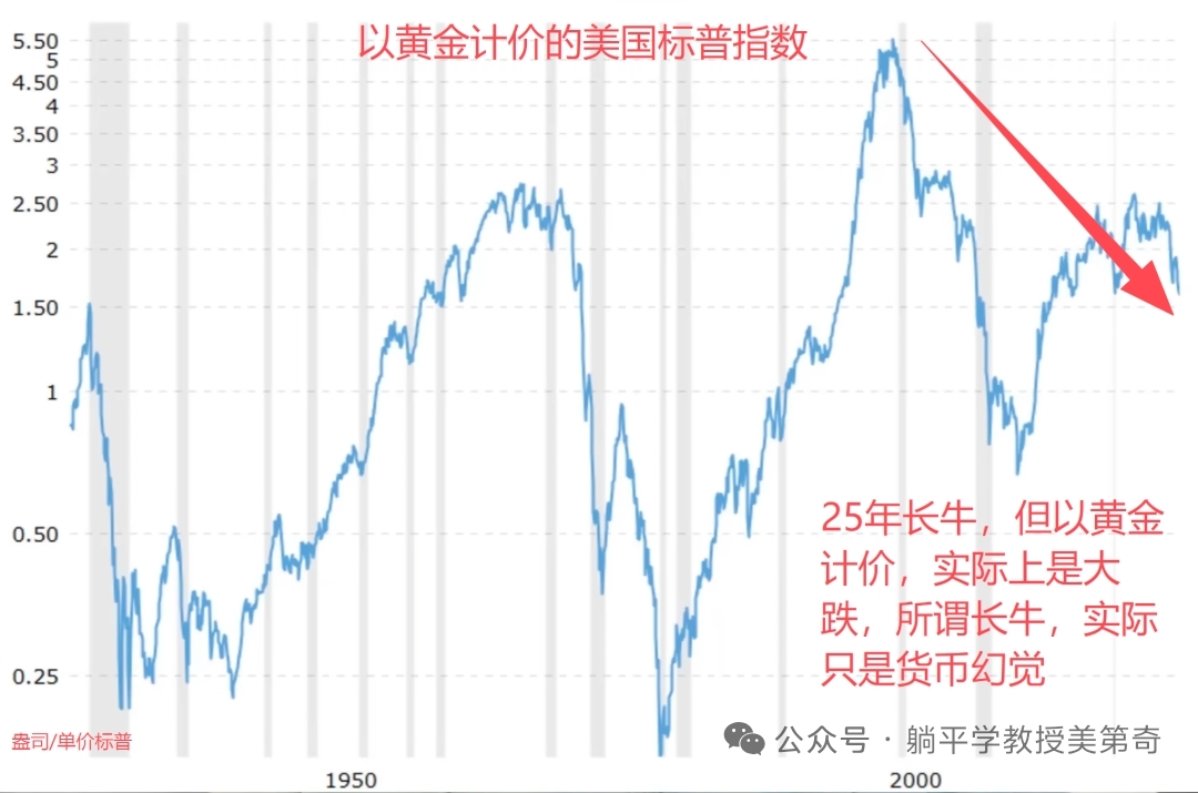 $方正证券(SH601901)$ 以美元计价,标普500指数过去25年上涨约4倍,年化回报约7%,算上股息可达9%,堪称梦幻曲线,绝对长牛典范。然而,若以黄金这一人类千年不变的终极价值尺度来重新衡量,曲线便崩塌了。2000年,购买一单位标普500需要约5盎司黄金;今天,仅需约1.6盎司。所谓的“上涨4倍”,实则为价值缩水70%。