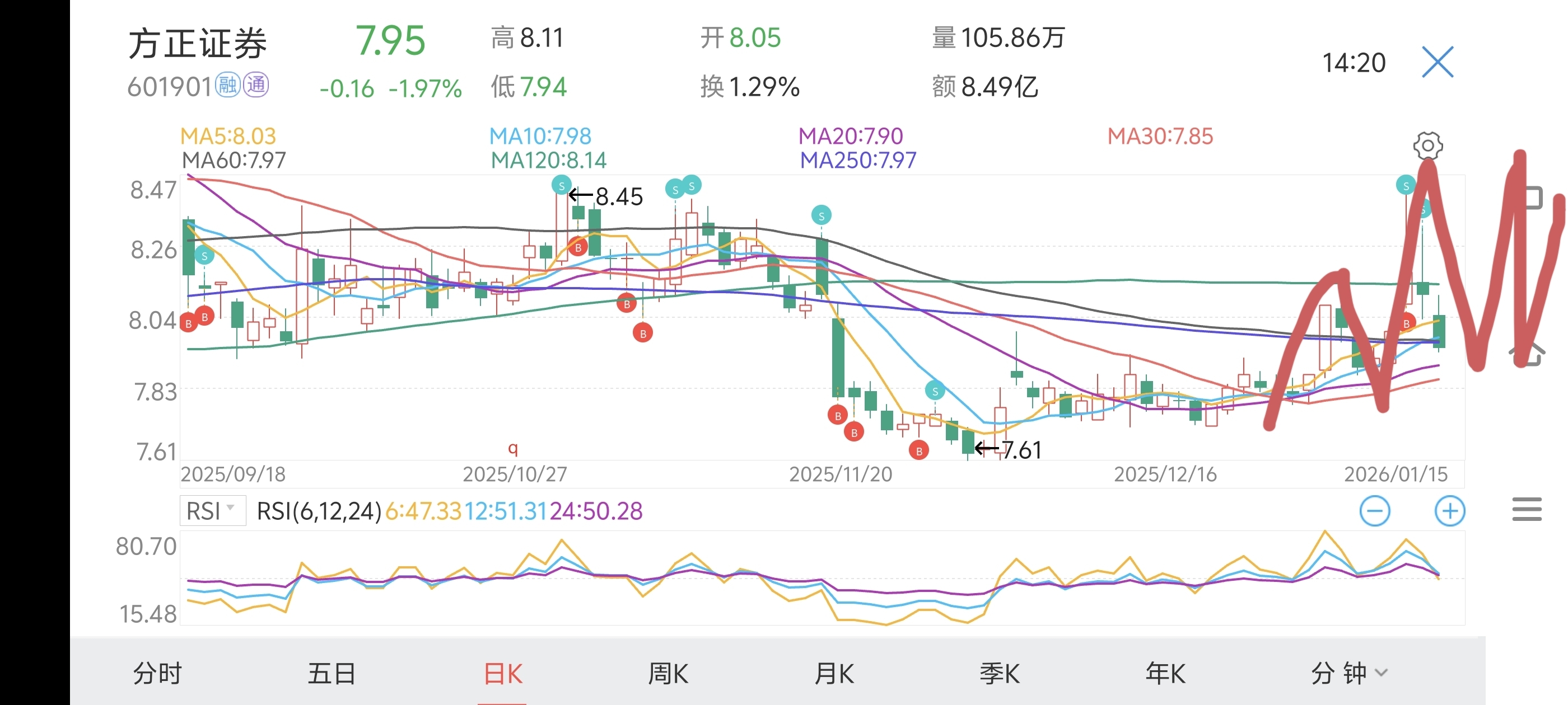 $方正证券(SH601901)$ 预测下后面7.9-8.4之间震荡构建新平台。搞小仓位高抛低吸前天8.34卖尾盘8.18买,昨天早上8.3卖今天7.95买。后面等年报公布拉涨。前天量那么大主力不可能套自己起码涨50%