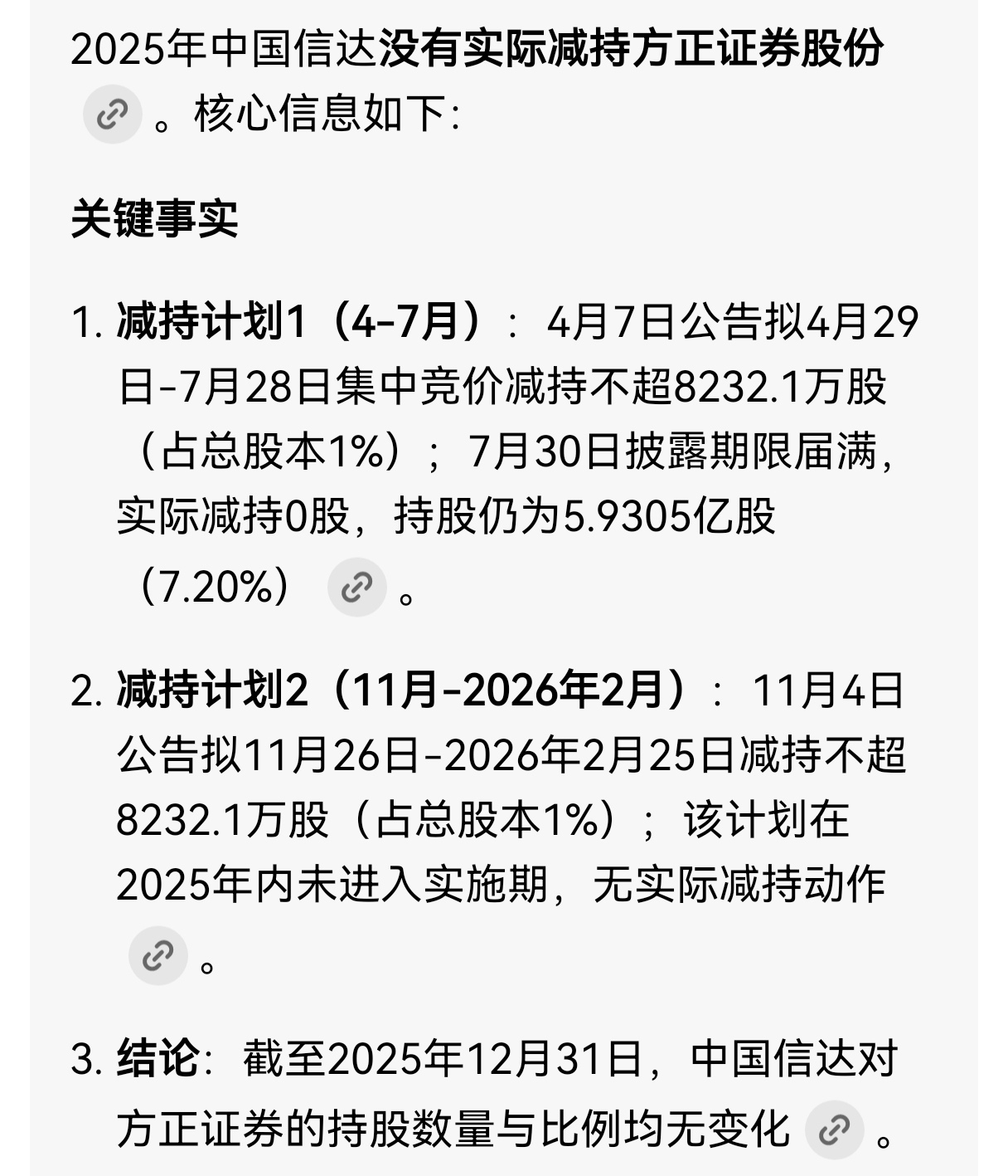 $方正证券(SH601901)$ 2026年不知道,中国信达开始减持方正没有?