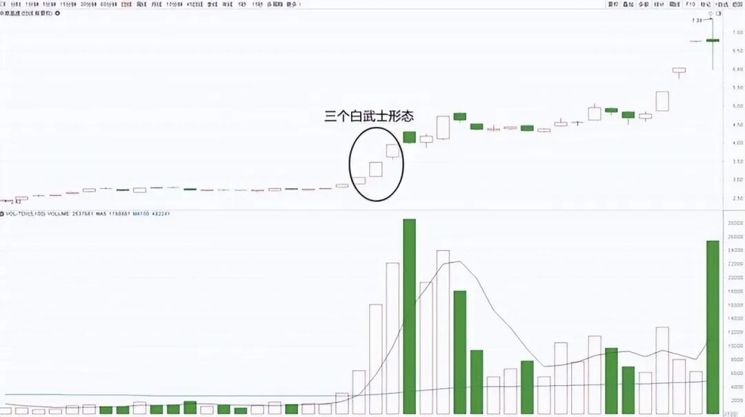 等方正“主升浪”启动前,K线都会出现哪些盘面特征:第一种形态:三个白武士三个白武